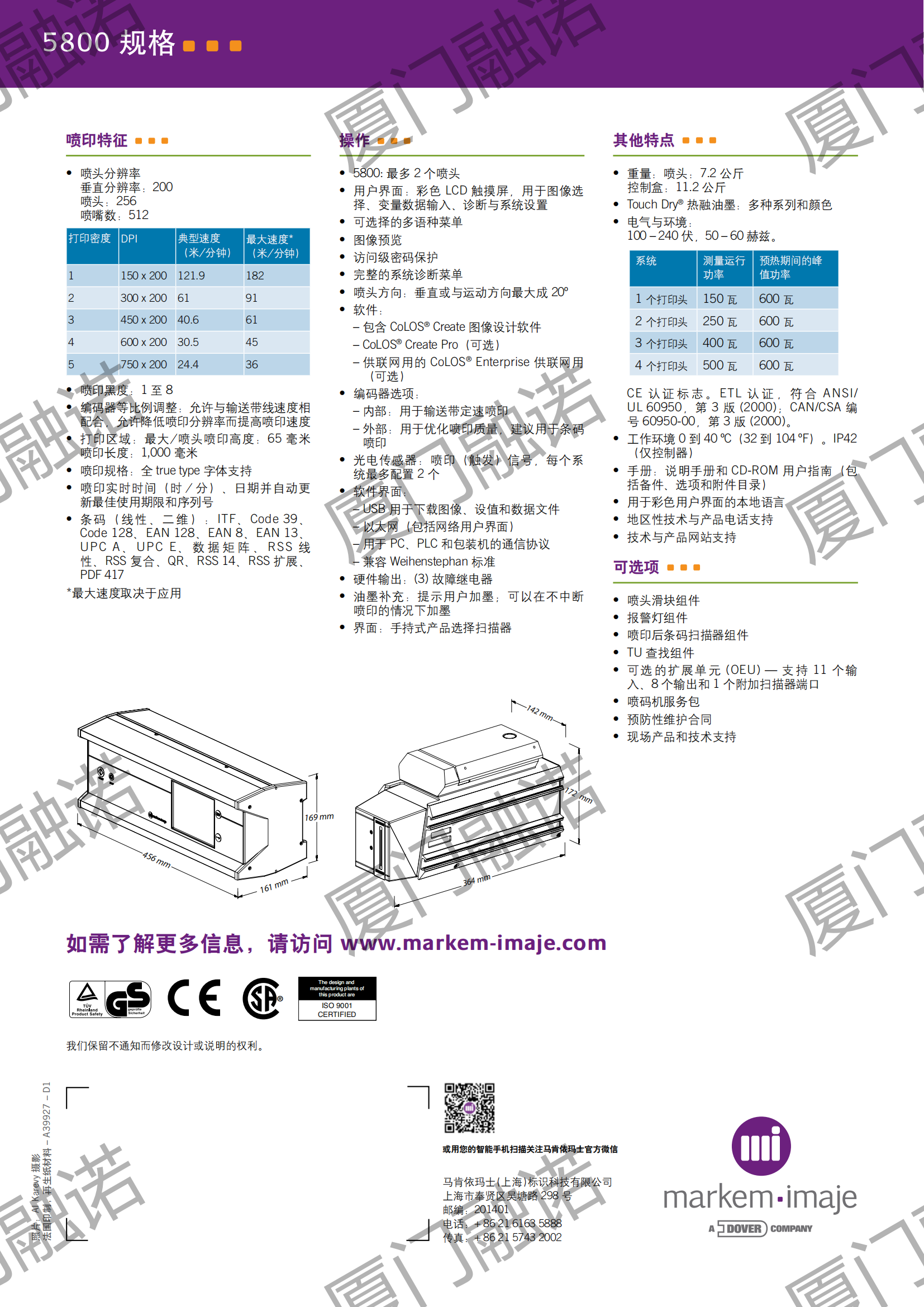 馬肯依瑪士 5800 大字符高解像度噴碼機可噴印編碼和徽標。其 Touch Dry熱融墨不含溶劑,條碼不會出現滲透或褪色,一接觸打印表面時瞬間即干,實現條碼可讀。